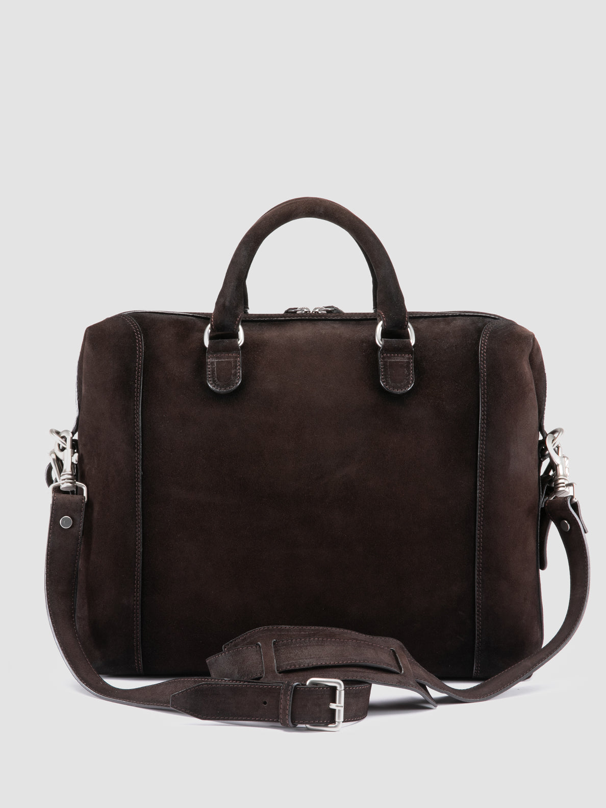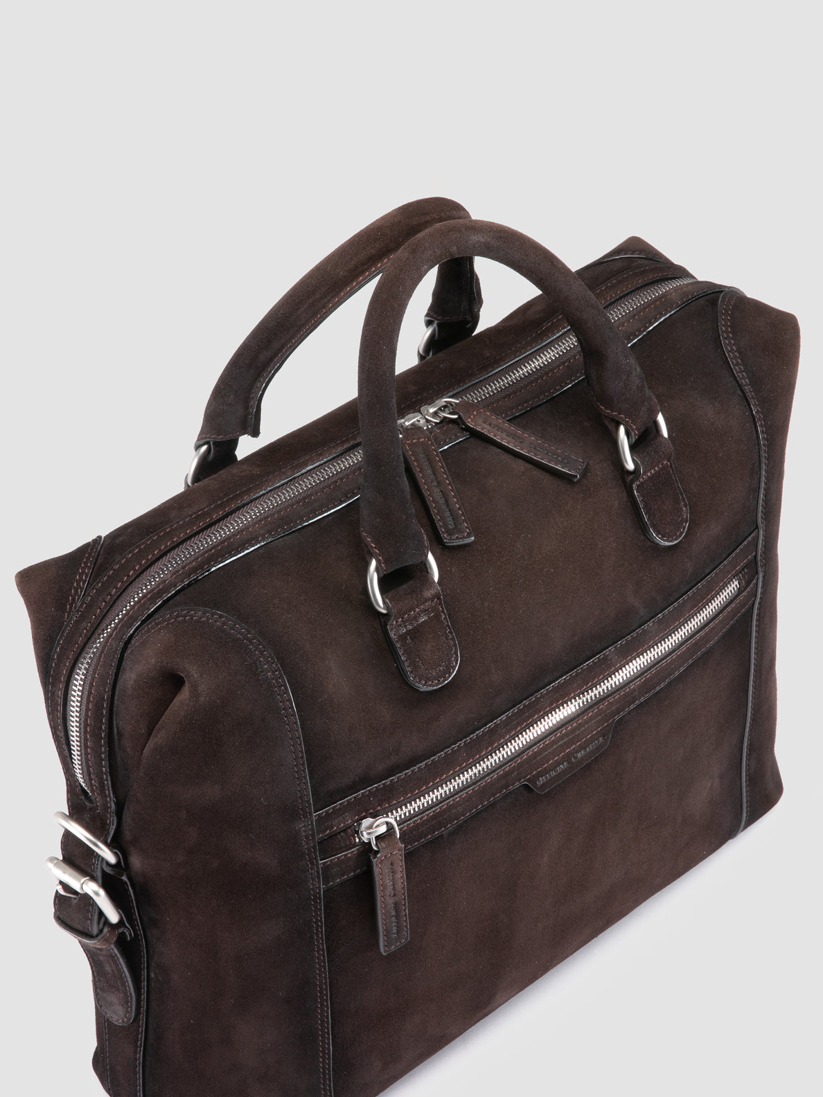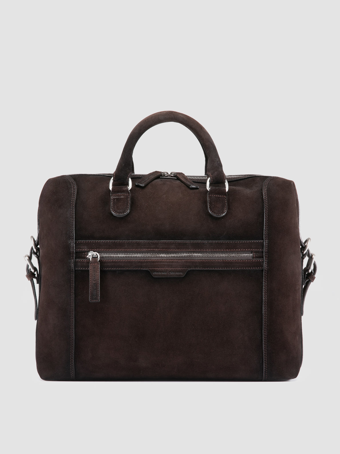 An icon of professional elegance, the Jules 003 briefcase is handmade in Italy from supple brown airbrushed suede. Blending luxury and function, it features a spacious interior, zippered security, top handles and detachable strap.