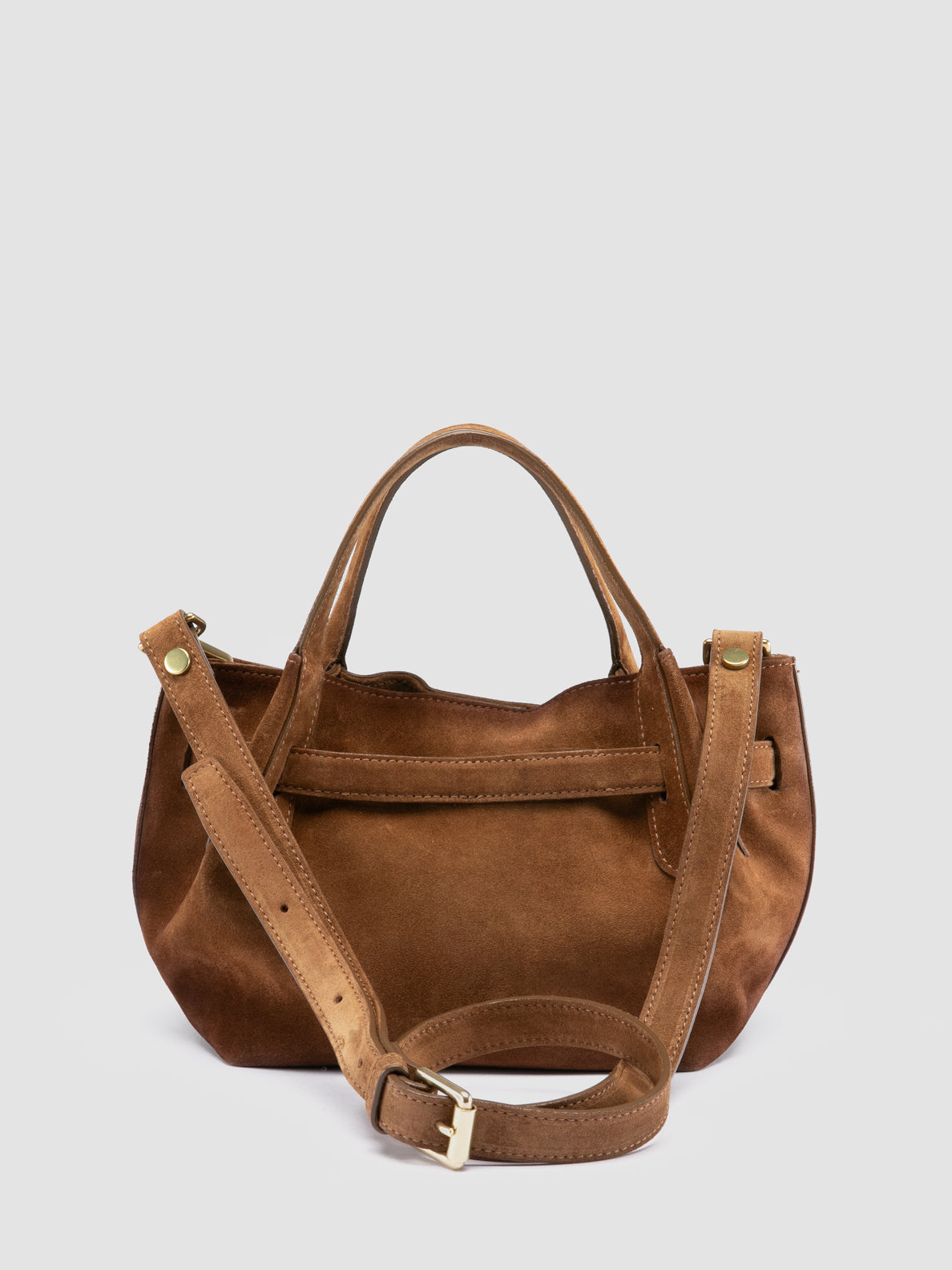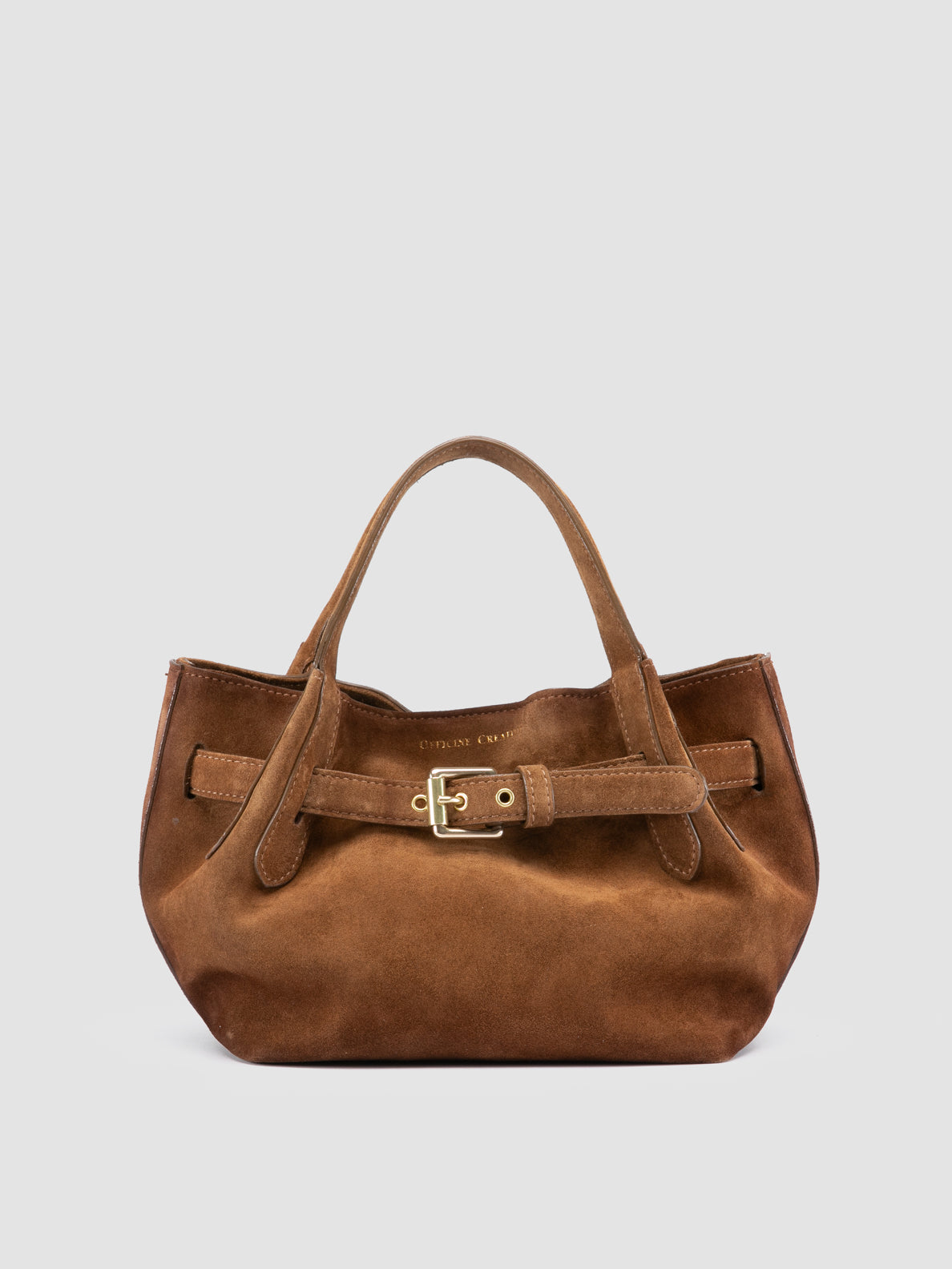 Handcrafted in supple brown suede, the Saddle 028 handle bag reimagines everyday elegance. The relaxed structure is paired with two top handles, a detachable shoulder strap and a front leather belt with a gold-tone buckle detail.