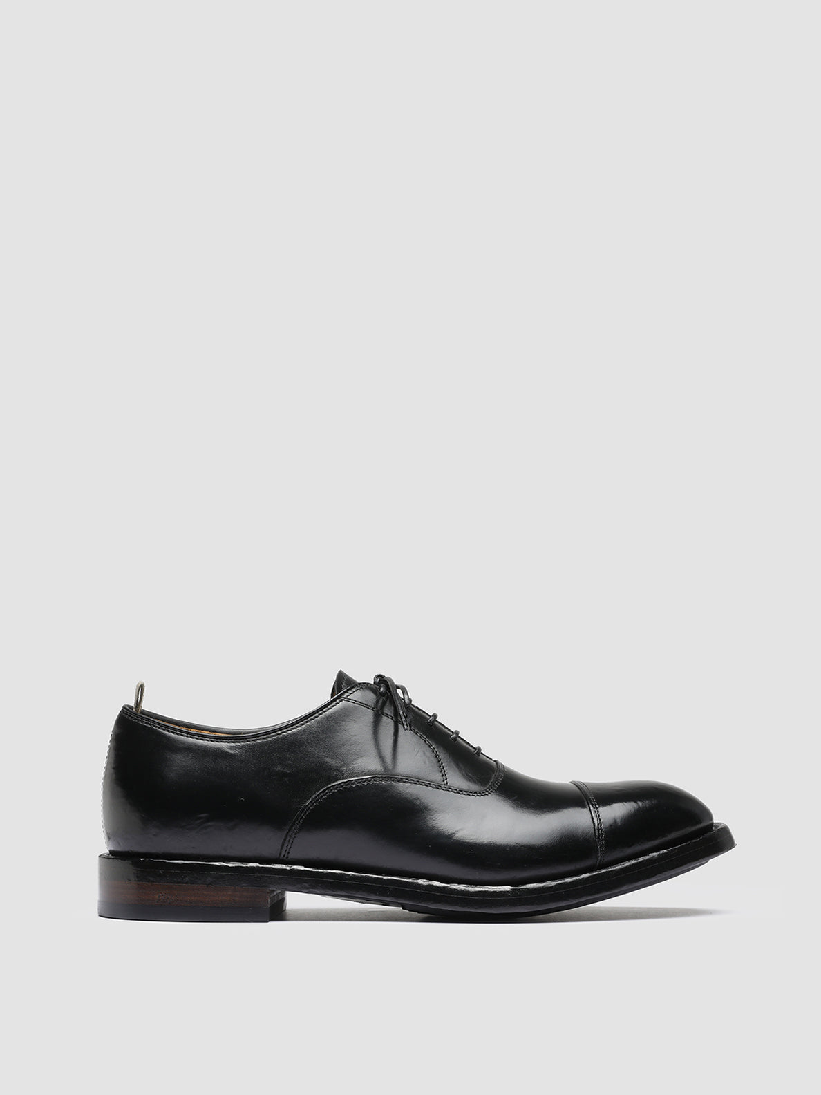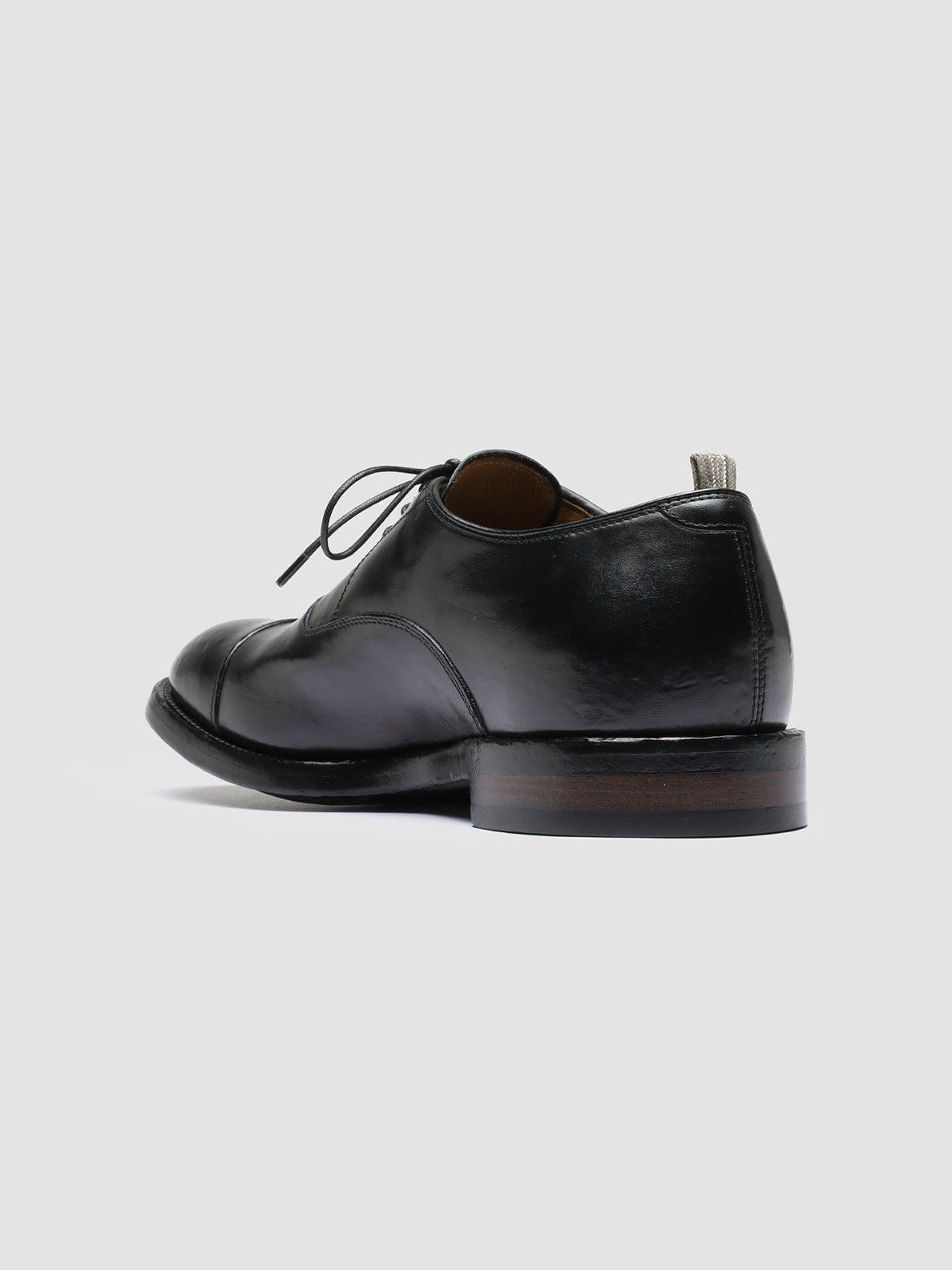 Our elegant Temple 001 Oxford shoes in premium black leather are unique and refined, featuring a smooth and uniform finish. Mounted on a leather and rubber sole with a stacked heel, they showcase a rounded almond toe, thin waxed laces, and our signature grosgrain heel loop tab.