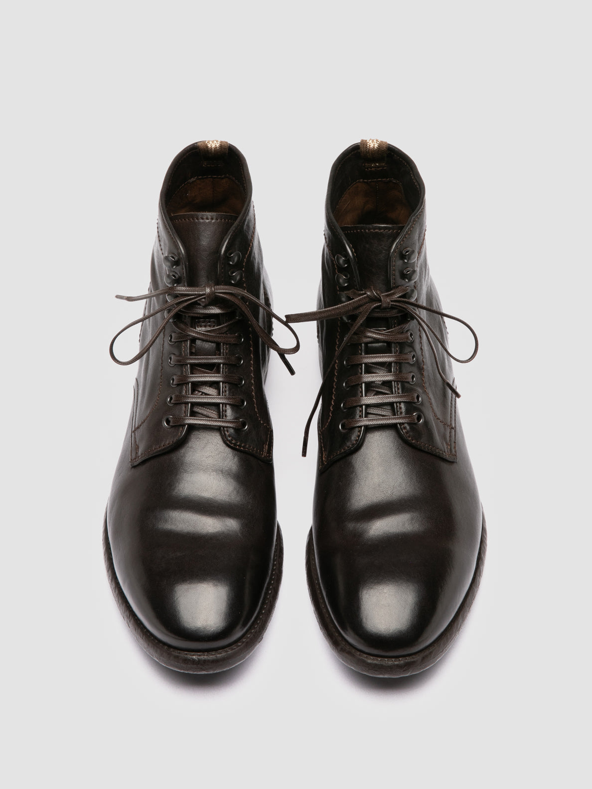 Stivaletti stringati in pelle marrone scuro con fodera in pelle e suola in gomma flessibile.